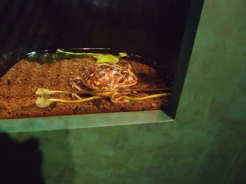 あっ。なんとマタマタの給餌に遭遇。きょうトト初めてです。お魚の切り身をもらってるんですね。どんな風に食いつくのかな。ドキドキ。反応が無いようです。おーい。ちょっと起きて起きて。再度。………反応が無いようです。再び起こされる、マタマタ氏。うぉっ…