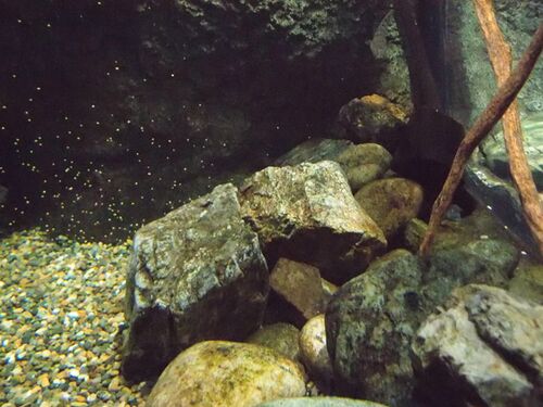 コンゴ川(手前)、給餌です。こまいの降ってきた。大陸棚の上がすごいことになった。住民総立ち・・・!!待って!わたしたちもいるわ!キタリヌスは浮いてるのを食べるタイプ。底の方も盛り上がっています。シルバーディスコダス、ポリプテルス・デルヘジ、水…