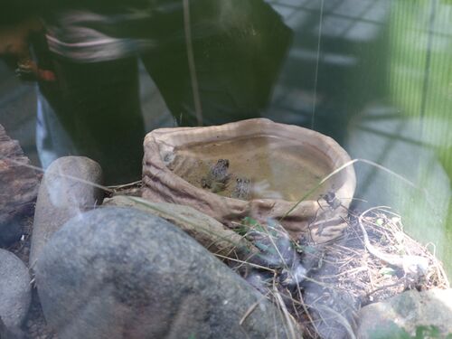 半透明ニホンアマガエル・黒目のクロちゃんが良いかんじに手前に。拡大してみると瞬膜が上がっているようなのですが、黒目なので全然わからない。寝てるんですかね。ニホンカナヘビの水槽ではヌマガエルが見られました。ヌマガエル久し振り!こちらはお水を…